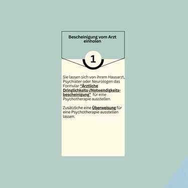 1) Sie lassen sich von ihrem Hausarzt, Psychiater oder Neurologen das Formular “Ärztliche Dringlichkeits-/ Notwendigkeitsbescheinigung” für eine Psychotherapie und eine Überweisung für die Therapie ausstellen.