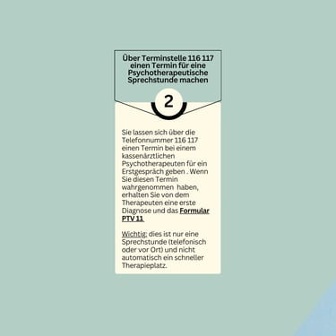 2) Sie lassen sich über die Telefonnummer 116 117 einen Termin bei einem kassenärztlichen Psychotherapeuten für ein Erstgespräch geben. Wenn Sie diesen Termin wahrgenommen haben und auch bei hier kein zeitnaher Therapieplatz angeboten werden kann, erhalten Sie von dem Therapeuten eine erste Diagnose und das Formular PTV 11 .