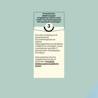 3) Sie rufen 5-8 Psychotherapeuten an und fragen, ob innerhalb von 3 Monaten ein Therapieplatz frei werden würde. Dokumentieren sie diese 5-8 “vergebliche Suche/Ablehnungen” in dem entsprechenden Formular.