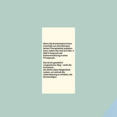 Die gesetzlichen Krankenversicherungen müssen ihren Versicherten innerhalb eines zumutbaren Zeitraums (bei Erwachsenen max. 3 Monate) einen Therapieplatz bei einer Psychotherapeutin oder einem Psychotherapeuten mit Kassenzulassung anbieten.